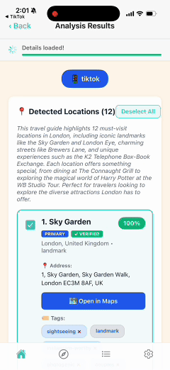 Smart AI scans videos and captions to find exact locations, addresses, and recommendations.